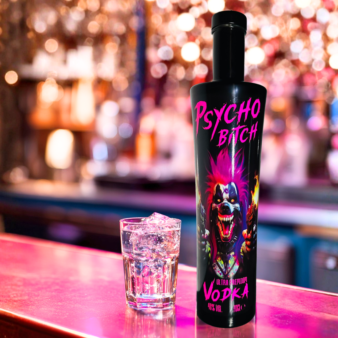 Why Psycho Bitch? Crafted small-batch in England, with crystal-clean taste and bold personality—ideal for home bars, gifts & making a statement.